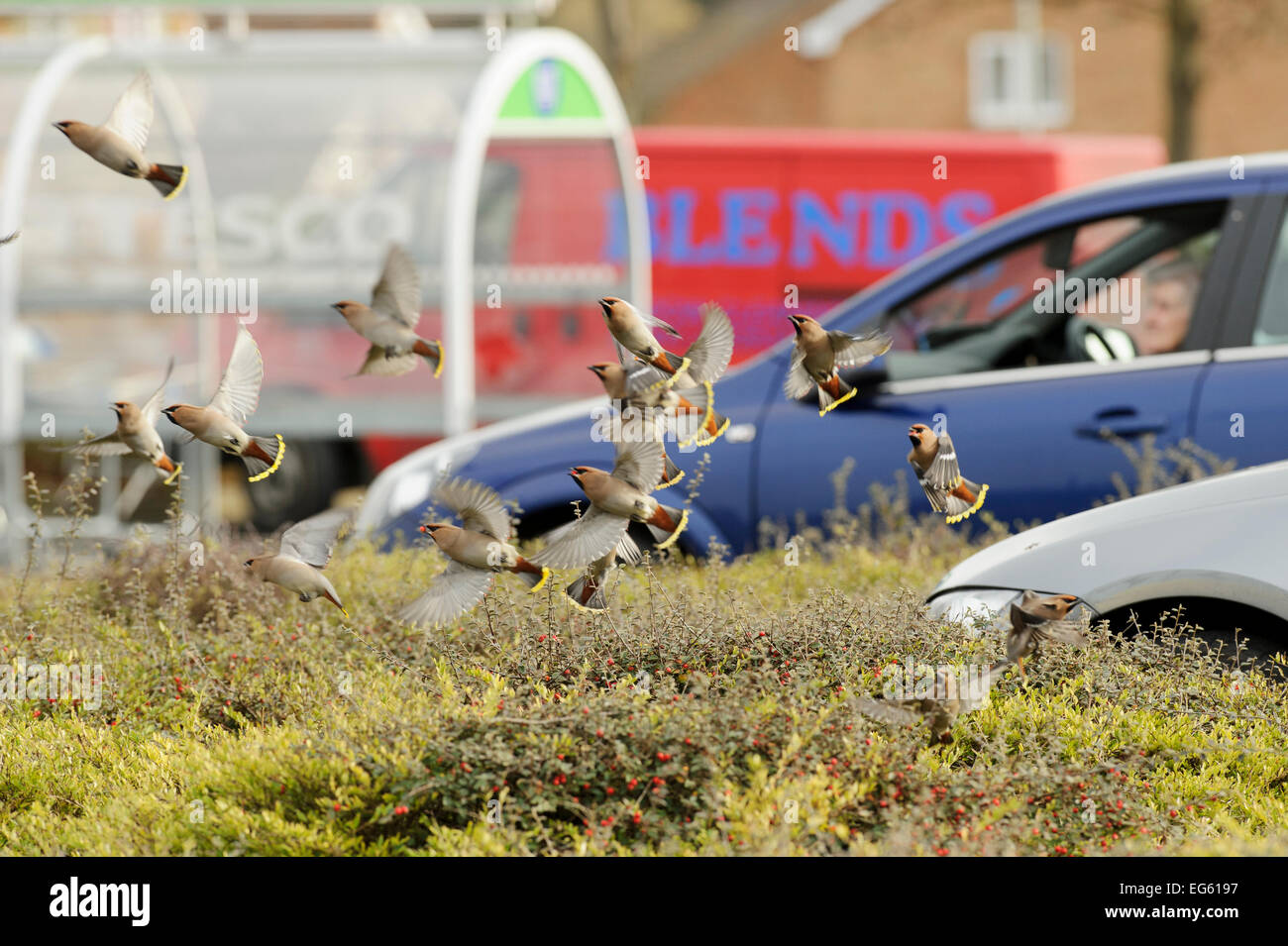 Flock Of Waxwings Bombycilla Garrulus Taking Off From A Low